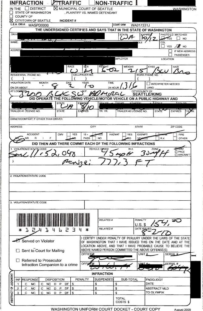 Google Maps, neither Manning, nor Spokane "intersect" with Admiral Way. Yet the officer says he was located at that "intersection". Since that intersection does not exist, we don't know where the officer was REALLY located. Without knowing where he was actually located, how can you defend yourself? Personally, I'd print out that map and take it to court.