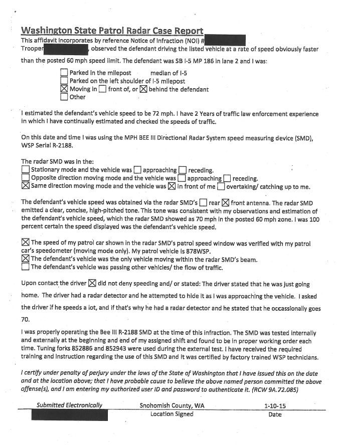 2. The wording of the paragraph regarding internal/external testing of the radar is not left to the judge’s interpretation. The officer very clearly fails to present evidence that he/she personally tested the unit that day, and instead makes an ambiguous, potentially misleading statement that