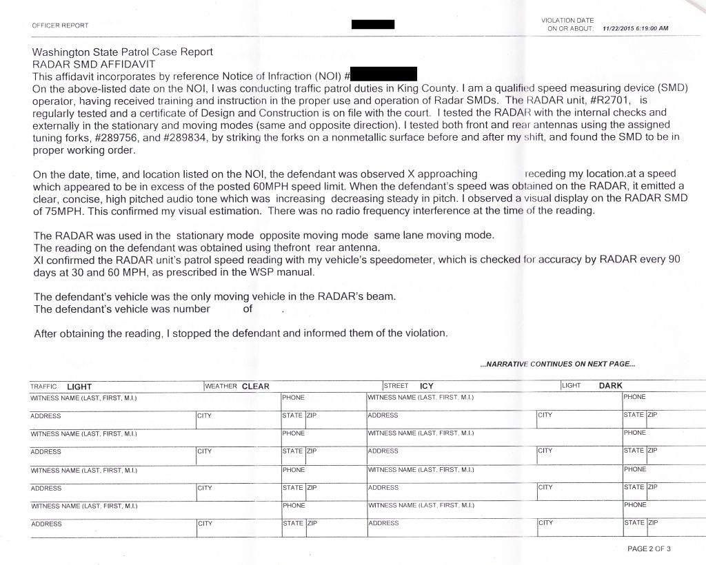 [x] I confirmed the RADAR unit's patrol speed reading with my vehicle's speedometer, which is checked for accuracy by RADAR every 90 days at 30 and 60 MPH, as prescribed in the WSP manual."
